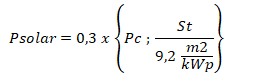 La potencia de generaci贸n fotovoltaica m铆nima de la instalaci贸n solar ser谩 el producto entre 0,3 y el valor menor entre la Potencia el茅ctrica contratada en el edificio (Pc , en kW) o la relaci贸n entre la Superficie total del techo (St, en m2) y el coeficiente 9,2 m2/kWp.